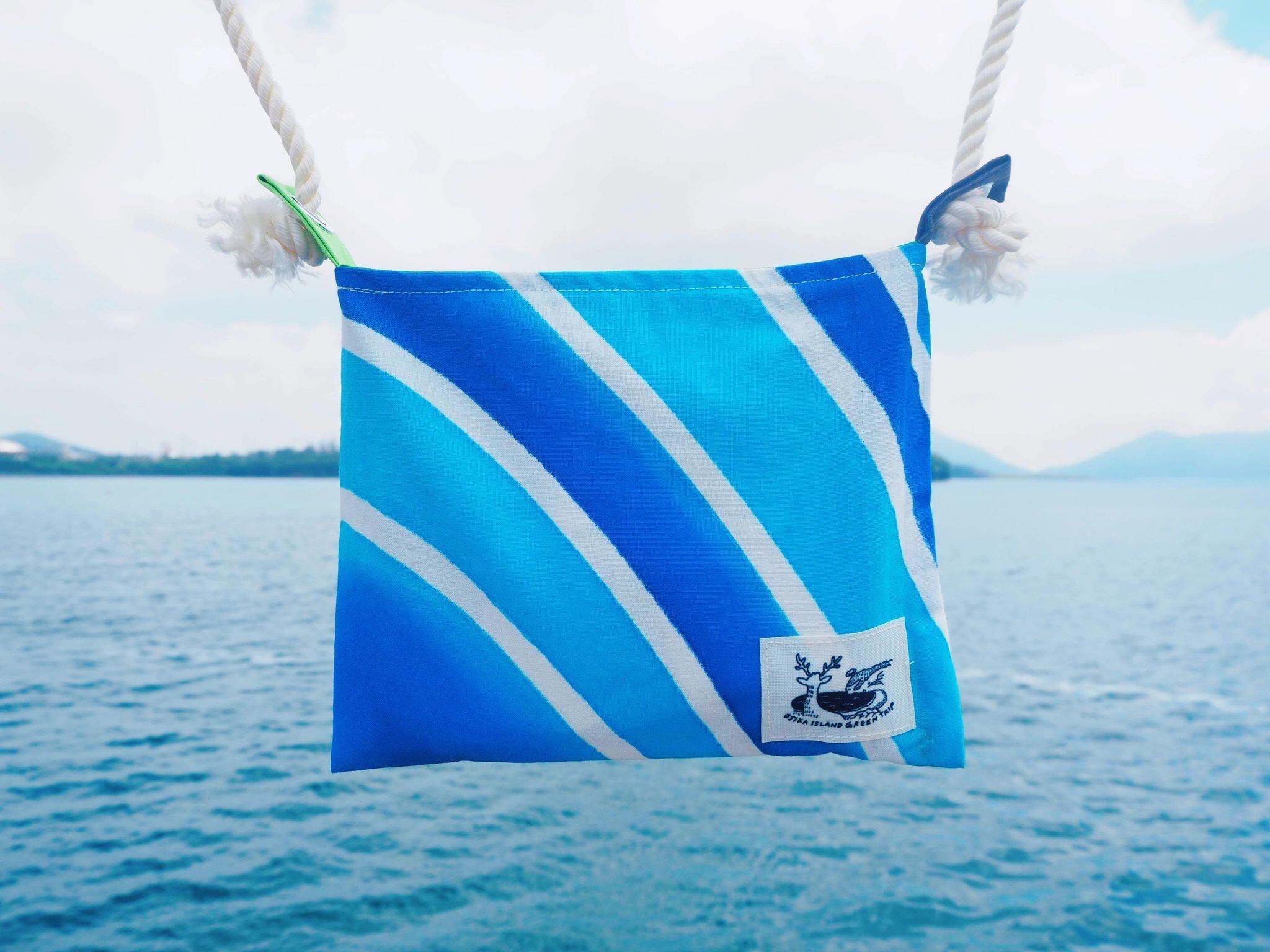 ショルダーバックはすべて島のお母さん方の手作りとなっており、布や紐は古い大漁旗や漁網を再利用しております。