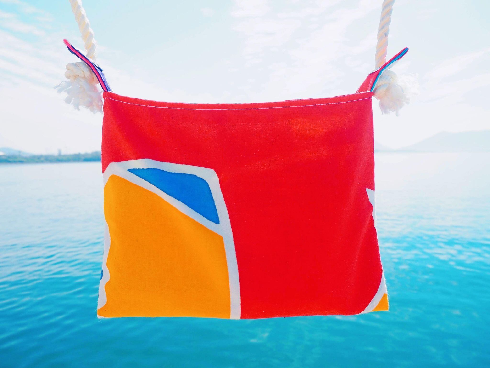 ショルダーバックはすべて島のお母さん方の手作りとなっており、布や紐は古い大漁旗や漁網を再利用しております。