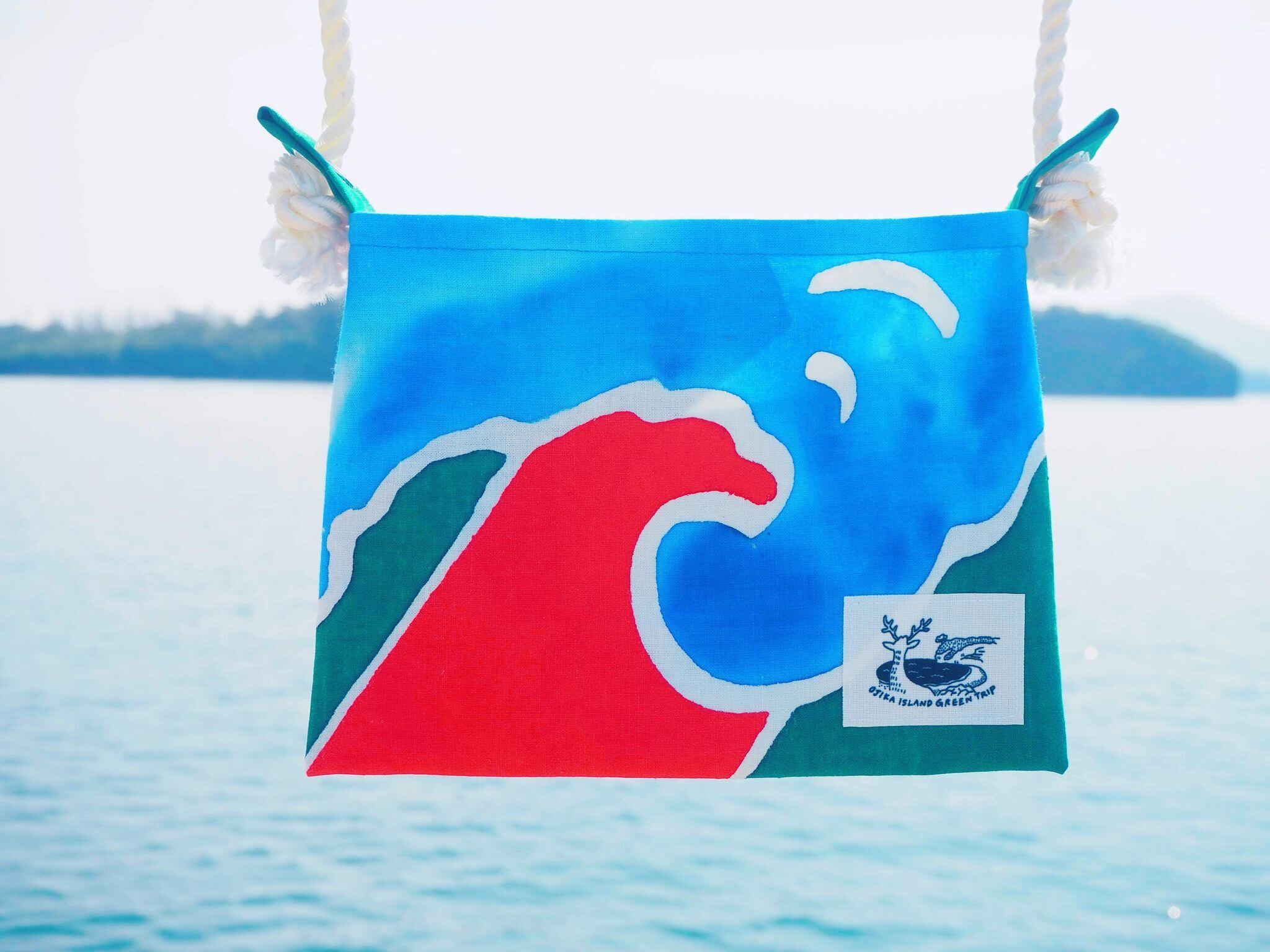 ショルダーバックはすべて島のお母さん方の手作りとなっており、布や紐は古い大漁旗や漁網を再利用しております。