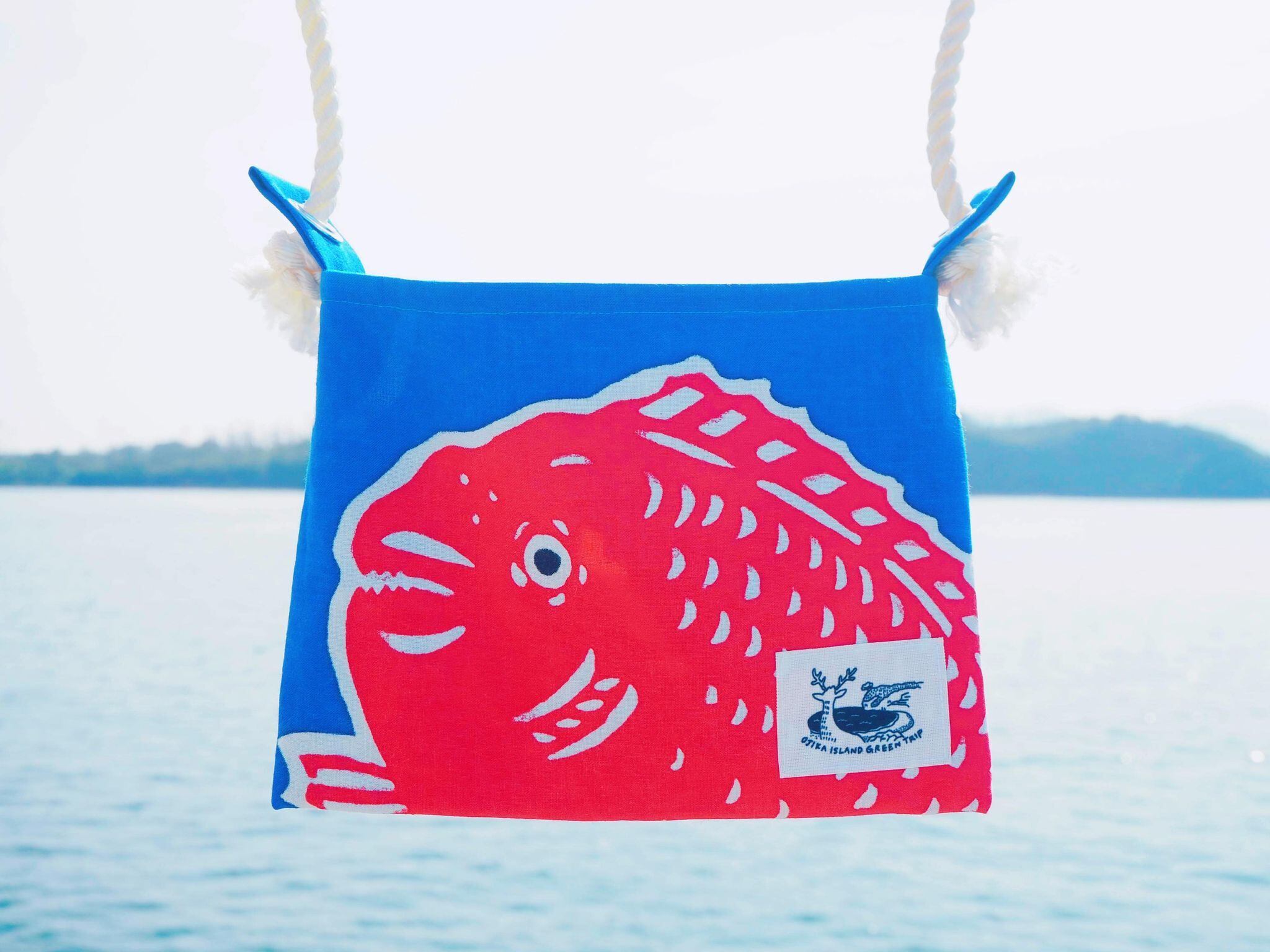 ショルダーバックはすべて島のお母さん方の手作りとなっており、布や紐は古い大漁旗や漁網を再利用しております。
