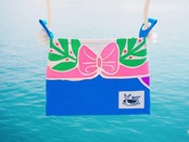 ショルダーバックはすべて島のお母さん方の手作りとなっており、布や紐は古い大漁旗や漁網を再利用しております。